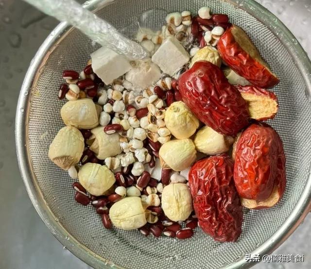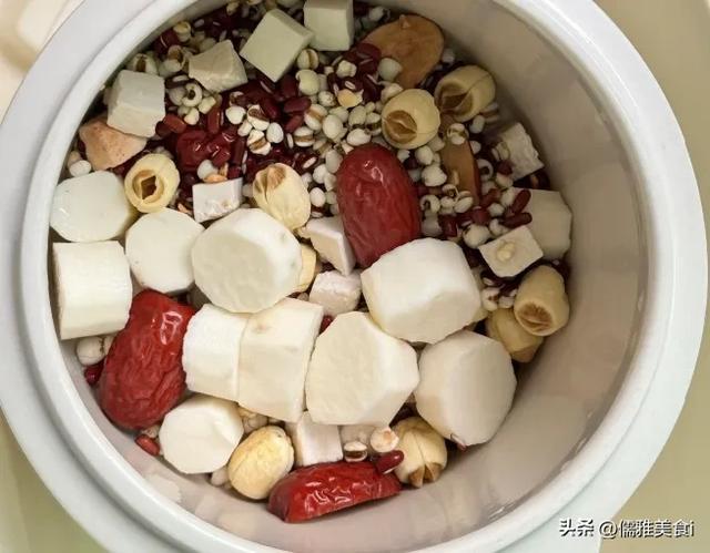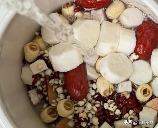 1. 提前一晚处理食材:山药、芡实、薏米、莲子洗净,用清水浸泡4小时(鲜山药可直接切块);红枣去核切小块,枸杞、桂圆肉洗净备用。