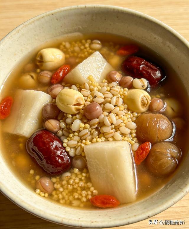山药、芡实、莲子(去芯)、薏米(炒过更佳)、红枣(去核)、枸杞、桂圆肉、小米